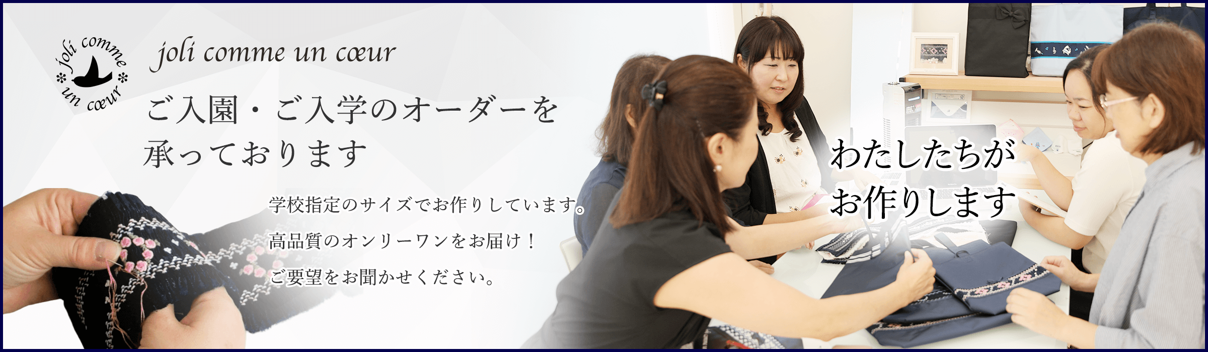 | 8 | 新入園・新入学のオーダー品は、通常より大変込み合いますので、毎年1月末日で一旦、締め切りとさせて頂いております。 学校指定のサイズ等、詳細が分からない場合でも、事前にご連絡を頂けましたらご相談を承ります。お気軽に連絡ください。 |