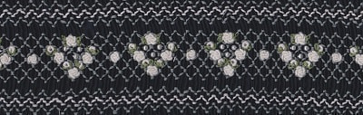 布に細かくギャザーを寄せひだ山をつくり、その山をひと針ずつすくいながら模様を施していきます。