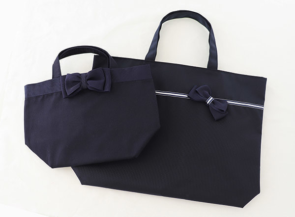 上品なリボンをあしらった紺無地ランチバッグとレッスンバッグ。