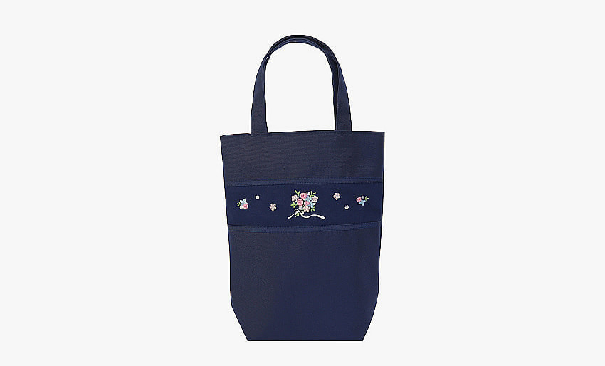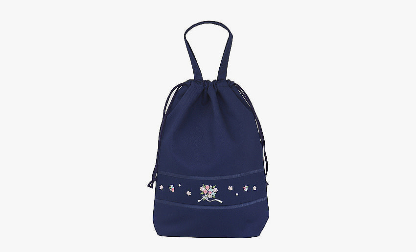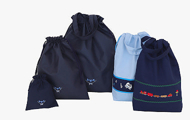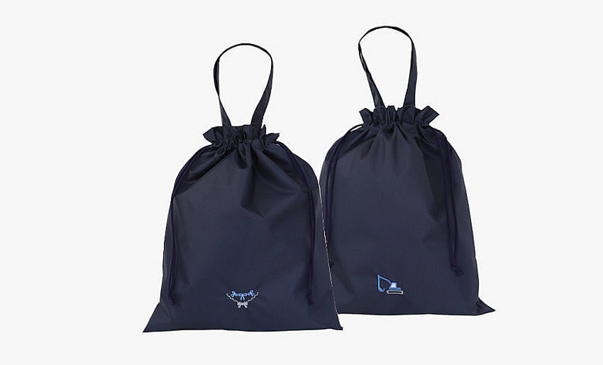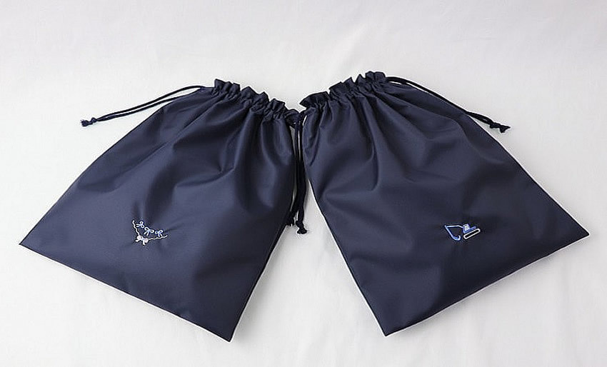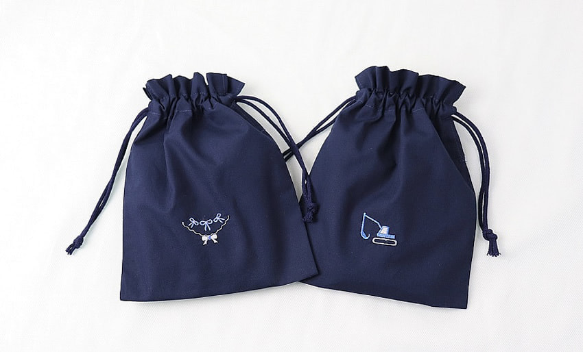 撥水加工の素材にシンプルなワンポイント刺繍をあしらった物や、美しさと温もりを感じる手刺繍入りの持ち手付き巾着袋も取り揃えております。